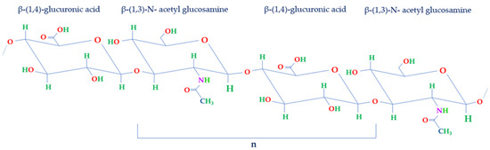 Comprising a glycosaminoglycan (GAG), HA consists of a repetitive arrangement of disaccharide units (n). These units are structured with β-1,4-glucuronic acid (GlcA) and β-1,3-N-acetyl glucosamine (NAG), interconnected by means of β-1,3 and β-1,4 glycosidic linkages (Figure 2) [1,2].