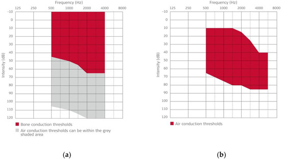 Although initially designed for sensorineural hearing loss with the FMT coupled to the long process of the incus [3], the VSB has also been demonstrated to be an effective alternative for conductive and mixed hearing loss when the FMT is coupled to the stapes or on the windows of the middle ear [4,5,6]. Audiological indications for the VSB are shown in Figure 2. It can be implanted in patients with normal anatomy or who have had previous middle ear surgery, with or without an available ossicular chain. It represents a versatile implantable device to consider, in addition to conventional hearing aids and bone conduction implants, for the personalized treatment of hearing loss.