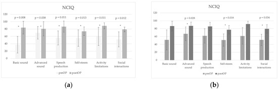 Preoperative (preOP) and postoperative (postOP) Nijmegen Cochlear Implant Questionnaire (NCIQ) results in the <60 y group (a) and in the ≥60 y group (b). * Statistically significant, p < 0.05.