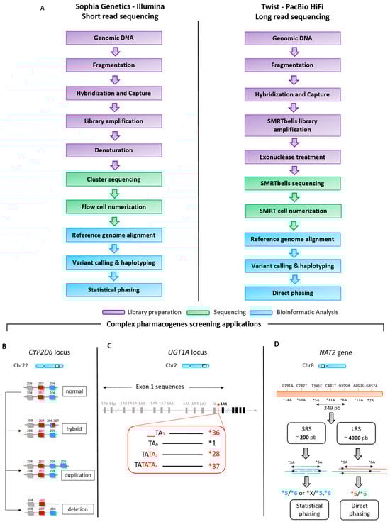 In the present study, we focused on three major actors: CYP2D6, UGT1A1, and NAT2. The cytochrome P450 2D6 (CYP2D6) is a highly polymorphic gene coding for CYP2D6. Patients with a CYP2D6 phenotype (ultra-metabolizer, UM, or poor-metabolizer, PM) have a higher risk of modified toxicity (e.g., tramadol, codeine) or modified efficacy (e.g., tamoxifen) depending on whether a drug is bioactivated or metabolized by CYP2D6 [4,5,6]. Due to a complex genomic architecture including CNVs and hybrids of the CYP2D6-CYP2D7 gene with homologous regions, having cutting-edge molecular tools is essential to enable effective biological analysis leading to individualized treatment [7]. Uridine diphosphate glucuronosyltransferase 1A1 (UGT1A1) is a gene comprising of a repeated nucleotide sequence of TA repeats in its promoter (Hg19/GRCh37 chr2:23466879-23466881). The TA repeated sequence is subject to a high degree of polymorphism directly affecting the expression level of UGT1A1. Patients diagnosed with Gilbert syndrome (UGT1A1*28) may be predisposed to potential ADRs under chemotherapy (e.g., irinotecan) [8,9]. The resulting phenotype is a reduced capacity of substrate glucuronidation by UGT1A1. Slow acetylator patients treated with the anti-tuberculosis drug isoniazid experienced ADRs due to the presence of specific variations in the N-acetyl-transferase 2 (NAT2) gene. Statistical and computational methods are required to infer the cis- and trans- haplotype configurations [10,11] as clinical variants are located on different exons. Clinical diplotypes derived from these statistically inferred haplotypes will determine the patient’s acetylation profile for the phase II enzyme NAT2 [12].
