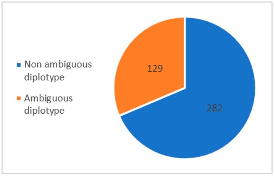 To compare the performance of direct phasing (LRS, WhatsHap) with statistical phasing (SRS, Stargazer), NAT2, a gene with a specific nomenclature depending on the location of each parental variant for phenotype determination, was chosen (Supplementary Table S1). NAT2 is a 9936 bp gene composed of two exons of which only one is coding, including all single nucleotide variants (SNVs) of clinical interest, which allows for the production of a functional enzyme NAT2. These SNVs are reported according to the international nomenclature as a star allele haplotype, with NAT2*4 being a wild-type allele without the presence of any clinical SNV. Phasing consists of the precise cis- and trans- allele location determination. Due to the difficulty in obtaining a reliable genotype–phenotype prediction using classical experimental methods of molecular haplotyping, phasing by statistical inference is widely used to determine the location of parental haplotypes after SRS. However, this method may fail to give the exact diplotype for some ambiguous genetic profiles. Among a recruitment of 411 patients from the Hospices Civils de Lyon addressed for ADRs concerning NAT2 drug substrates, we found 282 (68.6%) non-ambiguous diplotypes and 129 (31.4%) ambiguous diplotypes with a putative impact on the metabolic scoring of NAT2 (Figure 3, according to data included in the Supplementary Table S1).