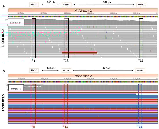 Comparison of fragment length, in SRS (top) and LRS (bottom), for NAT2 haplotypes *5, *11, and *12: direct phasing with WhatsHap module allows parental haplotype identification (red and blue fragments) using Integrative Genome Viewer (IGV). (A) Haplotypes *5,*11 and *12 viewed on SRS BAM using IGV. (B) Haplotypes *5,*11 and *12 viewed on LRS BAM using IGV.