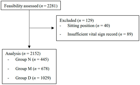 A total of 2281 patients underwent upper extremity orthopedic surgery under BPB during the research period. Of these, 40 cases in the sitting position and 89 cases with insufficient record length were excluded. The remaining 2152 cases (group N = 445, group M = 678, group D = 1029) were included in the analysis (Figure 1). There were 354, 343, and 343 missing values in the latest preoperative SBP, DBP, and HR data. The demographic and clinical characteristics of the included cases are summarized in Table 1.