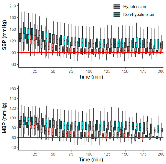 Hemodynamic changes in group D stratified by the occurrence of hypotension. Red and blue boxplots indicate cases with and without hypotension, respectively. The red solid horizontal lines indicate the thresholds of systolic blood pressure (SBP) and mean blood pressure (MBP).
