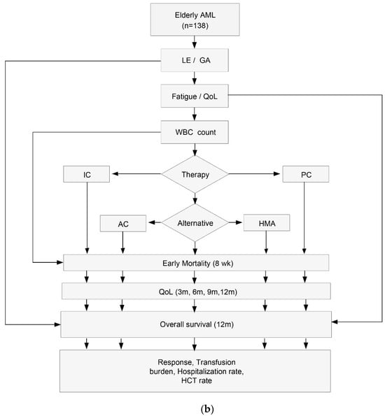 - Loh, K.P.; Abdallah, M.; Kumar, A.J.; Neuendorff, N.R.; Dahiya, S.; Klepin, H.D. Health-Related Quality of Life and Treatment of Older Adults with Acute Myeloid Leukemia: A Young International Society of Geriatric Oncology Review Paper. Curr. Hematol. Malig. Rep. 2019, 14, 523–535. [Google Scholar] [CrossRef]