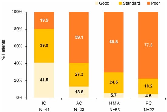 One hundred and thirty-eight patients initiated frontline therapy according to standard clinical practice (Table S4). The mean time (±SD) from diagnosis to therapy was 9.8 ± 14.3 days. Forty-one patients (29.7%) received IC, 22 (15.9%) AC, 53 (38.4%) HMA, and 22 (15.9%) did not receive active therapy but just PC.