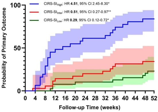 Finally, when the multivariate Cox regression models were computed by entering both high and low tertile of CIRS indices, the risk was higher, with a greater amount of disease severity and comorbidities (see Table 6 and Figure 2).