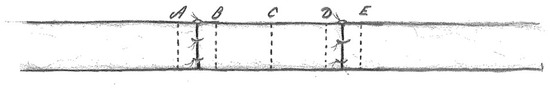 Figure 1. Sections of the sciatic nerve were obtained 2 mm proximal (A) and 2 mm distal (B) to the proximal nerve suture, in the middle part of the nerve graft (C), 2 mm proximal (D) and 2 mm distal (E) to the distal nerve suture.