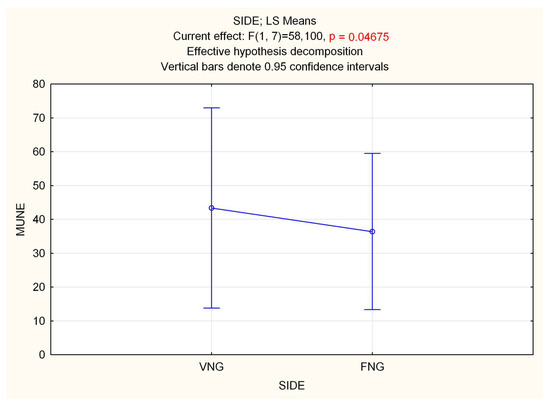 Statistical analysis of MUNE difference performed on side (VNGs vs. FNGs) in the GM muscle, showing a slight but significant decrease in MUNE value for FNGs side.