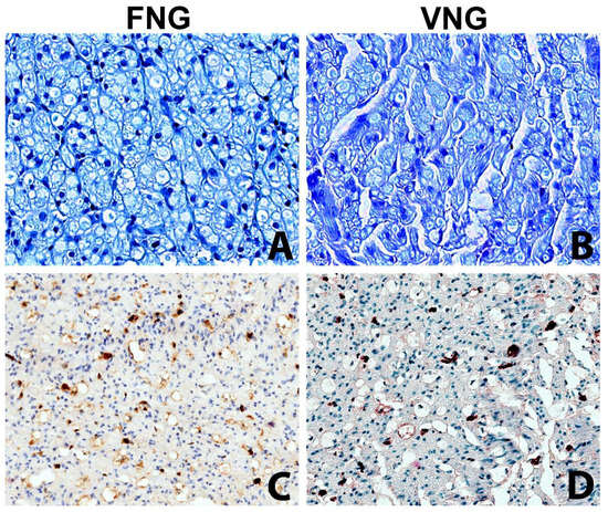 The intraneural microvascular density was assessed with the immunochemistry in VNG and FNG animal’s nerve sections (A,B) Nerve section of the nerve grafts 2 mm distal to the distal suture stained with Toluidine Blue (original magnification ×400). (A) left side, free nerve graft. (B) right side, vascularized nerve graft. No substantial differences between the two conditions. (C,D) Nerve section of the nerve grafts 2 mm distal to the distal suture stained with vascular endothelial marker (ERG) to assess the microvasculature (original magnification ×200); (C) left side, free nerve graft. (D) right side, vascularized nerve graft. The immunohistochemical stain highlights with a brown chromogen the nuclei of endothelial cells of intraneural microvessels, showing the presence of small capillaries in both sides.