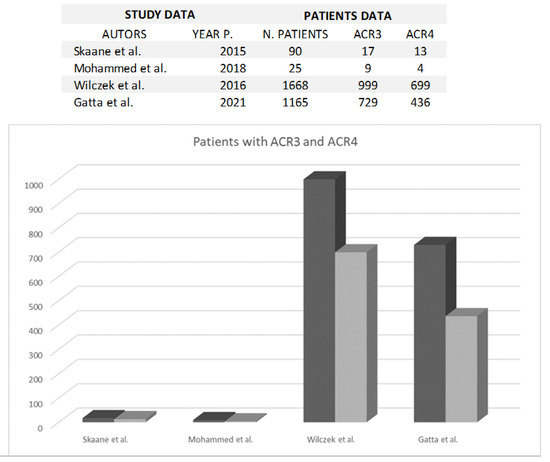 The figure shows the comparison between ACR 3 (black) and ACR 4 (grey) breast density classification in each study [3,8,11,26].