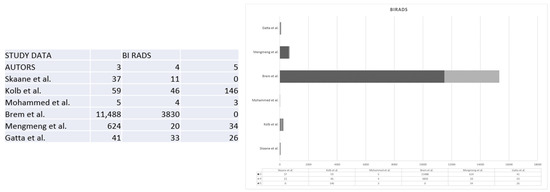 The figure shows the comparison between the BIRADS classification in 3, 4, and 5 of the lesions in the different studies [3,7,8,18,21,26].