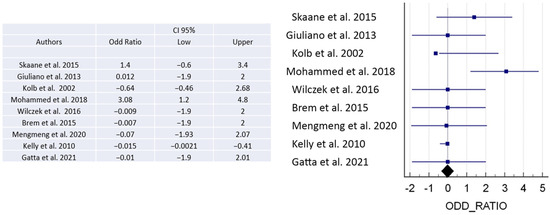 There is a clear link between particular risk factors and the onset of a disease, as evidenced by a numerical ratio. A ratio of less than 1 denotes a negative correlation, indicating a protective effect against the disease. Conversely, a ratio higher than 1 suggests a positive correlation, meaning a higher likelihood of developing the disease. The magnitude of the association becomes stronger with greater distance from a ratio of 1 in either direction. When examining the odds ratio from different publications, we can identify a likelihood ratio among the data of some of the studies. While some studies show odds ratios greater than 1 indicating a positive association with the disease, others demonstrate an odds ratio of less than 1, indicating a negative association [3,7,8,11,18,21,26] (Figure 5).
