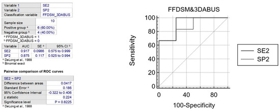 In various publications, the specificity and sensitivity of mammography alone have been evaluated using the ROC curve, resulting in AUC values between 0.70 and 0.87 for two variables. The comparison of two ROC curves showed an area difference of 0.167% and 0.041%, respectively. Based on these findings, the first graph indicates that FFDSM alone is moderately accurate, while the second graph indicates that FFDSM and 3D ABUS is highly accurate (Figure 8).