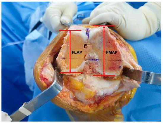 Intraoperative measurements of the anteroposterior length of the lateral femoral condyle (FLAP) and anteroposterior length of the medial femoral condyle (FMAP).