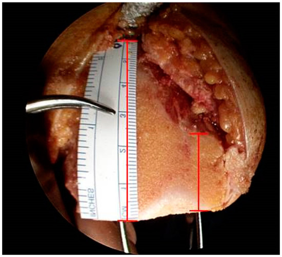 The varying types of morphology obtained on the anterior resected surface of the femur were classified [19,20]. The vertical distances of the medial and lateral condyles between the most proximal point of the anterior bone cut on the medial and lateral condyles and the line connecting the two most distal points of the anterior bone cut on both the lateral and medial condyles were measured. The ratio of the vertical distances from the medial condyle (MD) and lateral condyle (LD) was calculated after bone resection (Figure 3). Three groups categorized based on the MD/LD ratio were as follows: group 1: <0.65 (the boot sign group), group 2: ≥0.65 and <0.8 (the grand-piano sign group), and group 3: ≥0.8 (the butterfly sign group) (Figure 4a–c).