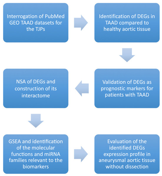 A trial flow of the current study is demonstrated in Figure 1. The list of TJPs that were assessed is demonstrated in Table 1. We started by interrogating the PubMed GEO database for datasets with aortic tissue samples from patients with thoracic aortic dissection to calculate the expression profile of the tight junction proteins. Secondly, we identified the differentially expressed genes in TAAD compared to healthy aortic tissue. The next step was to validate the DEGs as prognostic markers for patients with TAAD. In addition, we performed a nucleotide sequential analysis of the DEGs and we constructed their interactome. Moreover, we performed Gene Set Enrichment Analysis (GSEA) and identified the DEGs-associated molecular functions and miRNA families. Finally, we evaluated the expression profile of DEGs in aneurysmal aortic tissue without dissection. Although, our original purpose was to directly compare the expression profile of DEGs between aneurysmal aortic tissue with and without dissection, this comparison could not be performed due to the methodological heterogeneity among the different datasets.
