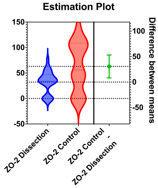 Estimation plot demonstrating the under-expression of ZO-2 protein in pathologic aortic tissue with dissection.