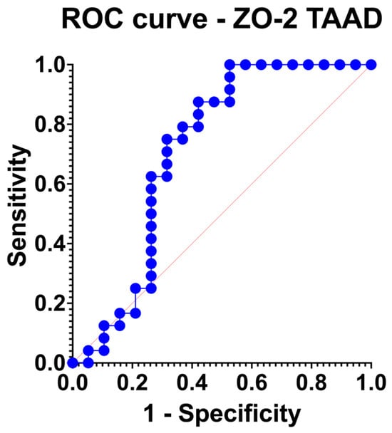 Receiver operating characteristic (ROC) curve demonstrating the discrimination traits of zona occludens 2 (ZO-2) protein expression profile to predict thoracic aortic aneurysm dissection.