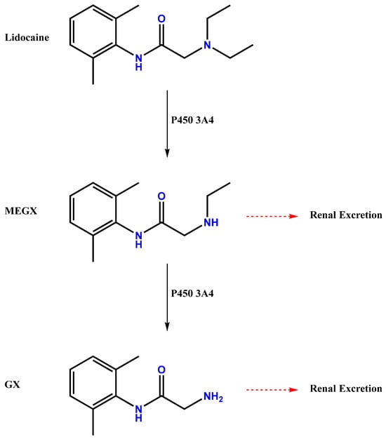 This drug is produced synthetically in pharmaceutical laboratories. The manufacturing process involves chemical synthesis from specific raw materials and is synthesized in a two-step process. The first step involves the reaction between 2-chloroacetyl chloride and 2,6-dimethylaniline to form an intermediate α-chloro amide. The second step involves an SN2 reaction between this intermediate and diethyl amine to form the final product, lidocaine [25,26]. In vivo, LIDO rapidly and extensively undergoes sequential oxidative N-dealkylation by cytochrome P450-3A4 in the liver to produce two active metabolites: monoethylglycylxylidide (MEGX) and glycylxylidide (GX) (Figure 1) [27].