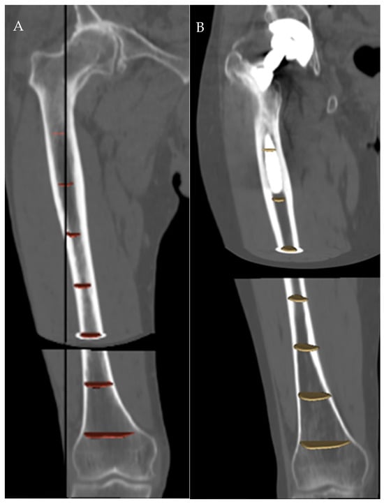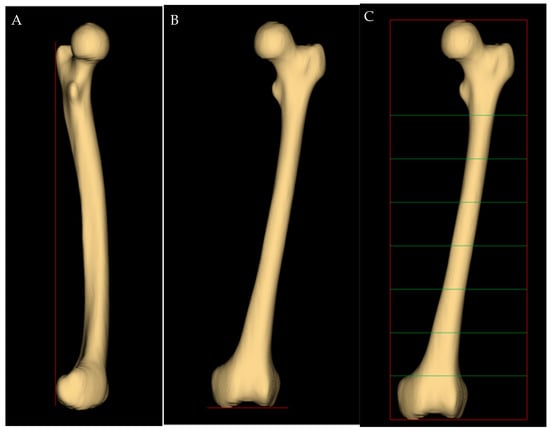 Image segmentation was performed using the free and open-source software 3D Slicer® (version 4.11.20210226, Brigham and Women’s Hospital, Boston, MA, USA). Before the measurements, the femurs were three-dimensionally oriented in a standard configuration, so that a plane was simultaneously tangent to the most posterior portion of the femoral condyles and the posterior margin of the greater trochanter (Figure 1A). The reference axial plane was placed at the lowest margin of the two condyles (Figure 1B), and the femur canal was then manually segmented at seven axial planes with 5 cm steps (Figure 1C).