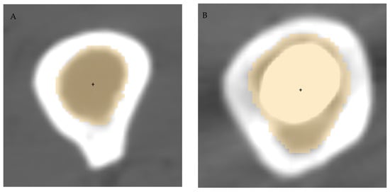 Segmentation of the femur canal (yellow shading) and identification of canal centroid (black dot) in the native side (A) and in the prosthetic side (B).