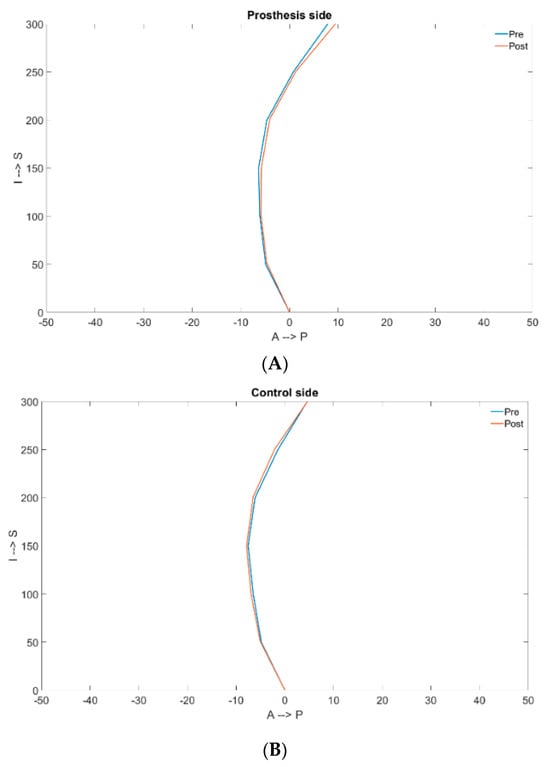 Comparison of the pre- and post-surgical femur curvatures in a prosthetic (A) and a native (B) side.