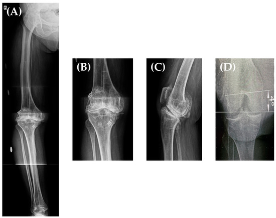 Taking all of this into account, we decided to perform a total knee arthroplasty on her right knee. Her preoperative planning long leg X-ray (Figure 3A,B) showed a grade II varus deformity of 12° (Hip-Knee-Angle—HKA of 168°), a lateral distal femoral angle (LDFA) of 89°, and a medial proximal tibial angle (MPTA) of 78° [13] with an increased posterior tibial slope and an IM angle (the angle between the femoral anatomical and mechanical axis) of 6°. Furthermore, in our clinic, we routinely perform a “seated view” X-ray which, according to our previous studies [14], helps in determining the distal femoral torsion. Using this special X-ray, where the patient sits on a radiolucent support with the knee flexed at 90°, we determine the posterior condyle angle (PCA) (and thus, the distal femoral rotation) by measuring the angle between the femoral trans-epicondylar axis (a line from the lateral epicondyle connecting it to the sulcus of the medial epicondyle) and the line connecting the posterior femoral condyles (Figure 3D); in this case, the femoral torsion was determined to be 4°.