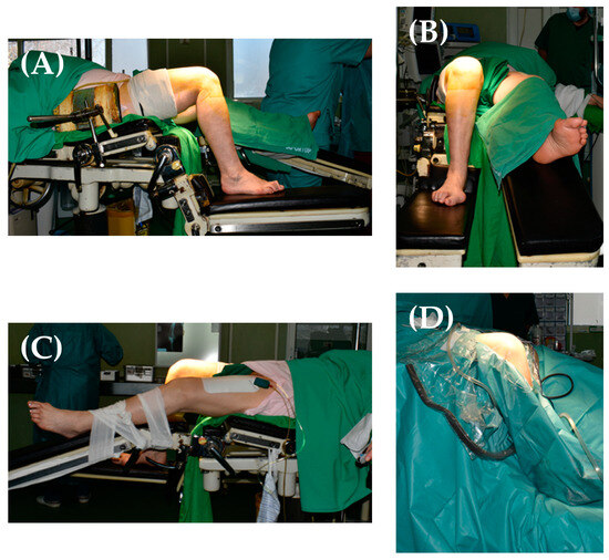 Patient’s position on the operating table and modifications made: thigh support (A,B); breaking the distal half of or table, which allowed for knee flexion of more than 90° and keeping the distal portion of the table in the normal position (A,B); positing of the contralateral limb in slight flexion (C); operating knee after sterile draping (D).