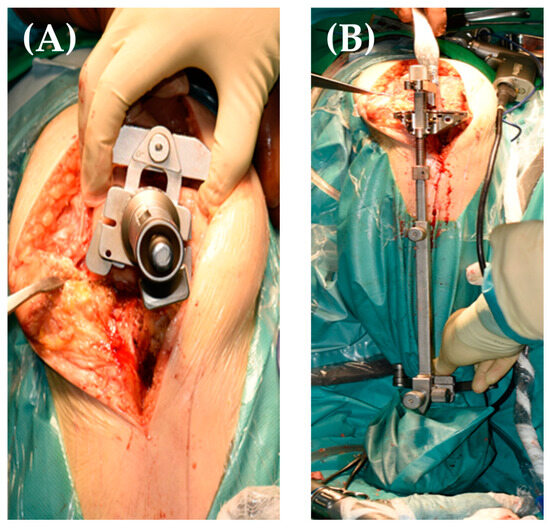 Medial parapatellar approach, placing the intramedullar distal cutting guide with the knee flexed at 90° (A), placing the extramedullar tibial cutting guide with the patient’s foot stable on the surgical table (B).