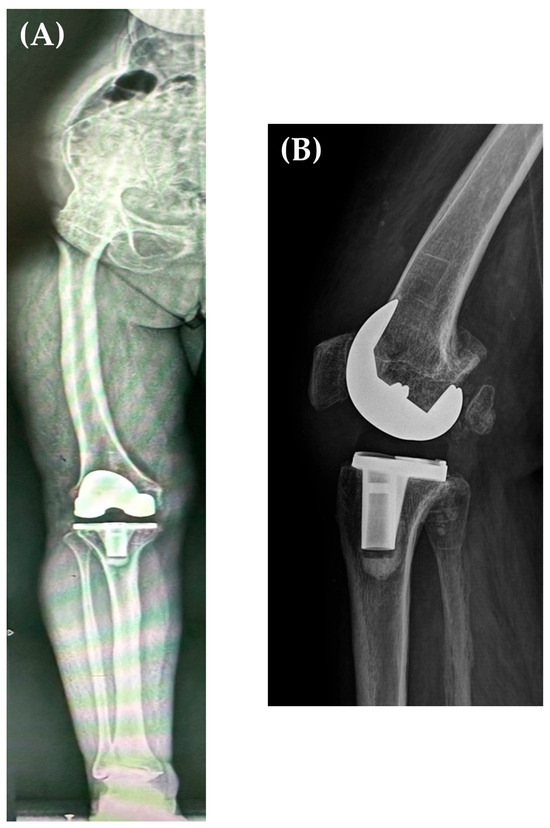 Postoperative X-rays revealed adequate positioning and sizing of the prosthetic components and a restored alignment of the lower limb. Personalized rehabilitation was initiated 24 h after the surgery, with knee flexion being recovered at the edge of the bed, and knee extension in lateral decubitus; weight bearing was allowed on the 1st postoperative day, and the patient started walking with the aid of crutches. Subsequent periodic radiological follow-ups at 3, 6, 12 months and annually up to 5 years (Figure 6A,B) did not show any signs of loosening (Figure 3). At her 3-month follow-up, the patient had an active range of motion (ROM) of 110° knee flexion and full extension (in lateral decubitus), walking without any aiding devices, with an increase in KSS from 26 to 84 points and WOMAC increase from 40 to 77.
