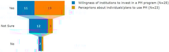 Among the 25 participants who responded to this question, 12 of them indicated that they were not sure about their institution’s level of investment in PM programs. A total of 11 participants affirmed that their institutions are willing to invest in PM programs, while 2 stated that, to their knowledge, their respective institutions are not ready and not willing to invest in PM. This study also sought to explore more about the perceptions of individuals’ plans to use PM in their work. A total of 23 participants responded to this question, and among them, 19 confirmed that they are planning to use PM in their work, whereas 3 were not sure about it, and only 1 said they were not planning to use PM (Figure 2). One respondent highlighted their feelings as follows: