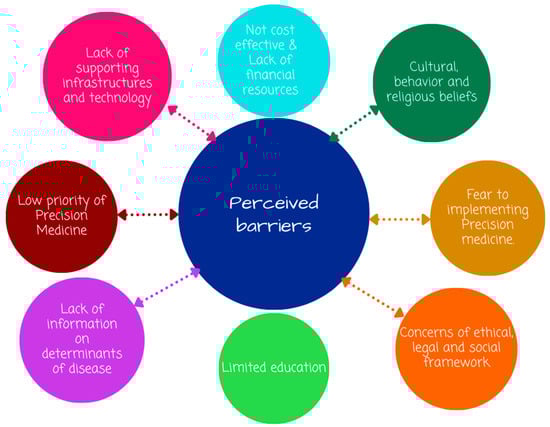 Studies have been conducted to evaluate the knowledge and awareness of PM in treating cancer. One study reported a very low familiarity with the term “PM” and a refusal to participate in clinical trials due to fear of receiving the placebo, which may affect the right course of treatment []. Although the PM field is advancing in high-income countries, there is still a low implementation of PM in LMICs due to a lack of funding and limited awareness and understanding of its potential impact []. Additionally, a study conducted in the African region revealed that over 80% of the study participants, comprising physicians, postgraduate students, laboratory heads, and scientists engaged in research activities, were using or planning to use advancing genomic technologies in their research. However, the study also highlighted the limited awareness of the PM field. Only 14% of the study participants reported that scientists in their countries are ready to implement PM or genomic medicine. Moreover, more than 40% reported needing more information and access to the appropriate infrastructure []. The unavailability of infrastructure and a qualified scientific capacity, limited resources, and suboptimal regulations are major barriers to the provision of PM in LMICs. All the above-mentioned challenges could worsen global health inequality, as patients in LMICs could die from preventable diseases. Therefore, it is crucial to establish and strengthen PM in LMIC healthcare settings.