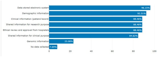 Information concerning patient details and documentation status in routine healthcare settings is important to know, as data are the main tools that guide PM (Figure 4). Almost all participants (96%) mentioned that patients’ data are stored in an electronic system, and 88% of the study participants responded that they share patient information with collaborators for clinical care purposes or research purposes upon approval by ethical review committees and the hospital leadership. Meanwhile, 92% reported routine collection of demographic information in five health facilities. The collection of genomic data in the health care facilities was reported by 23% of participants, and only 7% of the study participants reported that they do not collect patients’ data routinely. (These were the study participants from the MOH or RBC, as they do not meet patients in their routine activities).