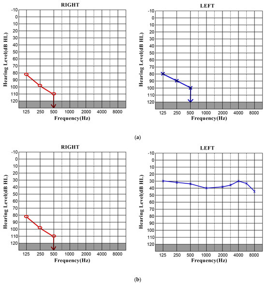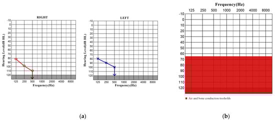 The pure-tone audiometry (PTA) showed profound SNHL in both ears, and the respective cochlear implant indication range is shown in Figure 1a,b, respectively.