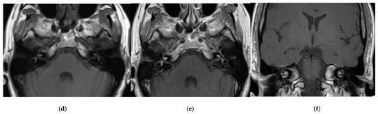 A diagnosis of bilateral audio-vestibular disorder was performed. A CT scan showed a discrete change in the white matter in the front left at the border of the corona radiata and the centrum ovale near the cortico-subcortical border. The MRI findings indicate labyrinthitis more to the right side with signs of possible hemorrhage in the membranous labyrinth (Figure 2a–f).
