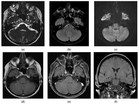 Magnetic resonance images. Hyperintense signal of cochlea, vestibule, and part of semicircular canals on both sides, more prominent on the right side, indicating labyrinthitis and signs of possible bleeding in the membranous labyrinth in axial T2W SPACE (a), coronal FLAIR (b), axial DWI (c), axial precontrast T1WI (d), and axial (e) and coronal postcontrast T1WI (f). MRI findings.