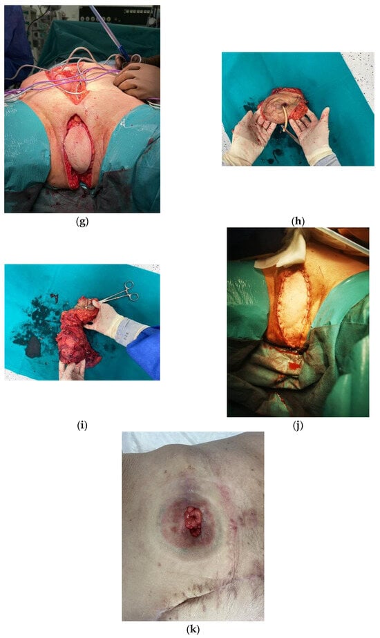 VRAM Flap for Pelvic Floor Reconstruction after Pelvic Exenteration. (a) Pre-incision measurement of the desired/ intended abdominal myocutaneous flap (16 × 8 cm). (b) Preparation of the myocutaneous flap of the rectus abdominis muscle. (c–e) Preparation of the myocutaneous flap of the rectus abdominis muscle. (f,g) Appearance of the perineal wound before and after the application of the flap. (h,i) En-bloc surgical resection specimen (j) Final appearance of the perineal region after vertical abdominal rectus muscle flap reconstruction. (k) Final aspect of the stoma and of the abdominal scar.
