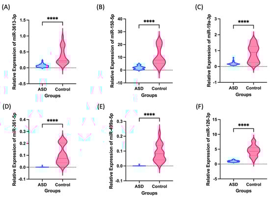 Box violin plots of relative miR-3613-3p (A), miR-150-5p (B), miR-19a-3p (C), miR-361-5p (D), miR-499a-5p (E), miR-126-3p (F); expression level in ASD (n = 45) and healthy control (n = 21). Asterisks denote significant differences by unpaired t-test, **** < 0.0001.