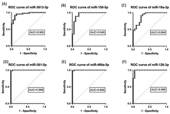 Evaluation of the diagnostic effectiveness of autism-specific miRNAs’ biomarkers. ROC curve of (A) miR-150-5p, (B) miR-19a-3p, (C) miR-361-5p, (D) miR-499a-5p, (E) miR499a-5p, and (F) miR-126-3p with area under the curve (AUC) values. ROC, receiver operating characteristics.