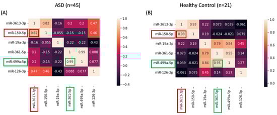 Pearson’s correlation analysis of six miRNAs. (A) Correlations between miRNAs in the ASD patients. (B) Correlations between six miRNAs in the healthy control.