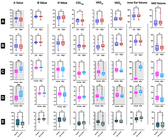 Descriptive characteristics of the study cohort. (A) Descriptive Statistics of the whole population (N = 42) by side of the ear (described as mean ± SD, Minimum, and Maximum, (B) Baseline characteristics for Cochlear Implanted ears (N = 33) by side of the ear, (C) Descriptive Statistics of the whole population (N = 42) by sex (described as mean ± SD, Minimum, and Maximum, (D) Baseline characteristics for Cochlear Implanted ears (N = 33) by sex, (E) Descriptive statistics of Cochlear implantation patients’ ears by Gusher outcomes, *: Significant p-Value (p ≤ 0.05), **: Significant p-Value (p ≤ 0.01), ***: Significant p-Value (p ≤ 0.001), ns: nonsignificant p-Value (p > 0.05), CDL: cochlear duct length, OC: organ of corti, VADm: vestibular aqueduct width at the midpoint, VADo: vestibular aqueduct width at the operculum). Male is colored light blue, Female is colored pink, Right is colored red, Left is colored dark blue, Gusher is colored dark green, and No gusher is colored light green.