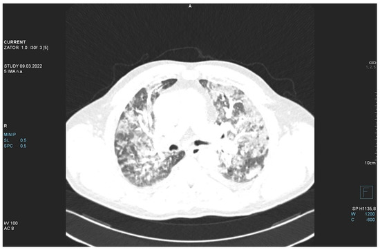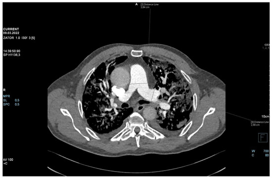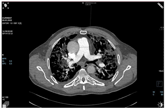 The patient required oxygen therapy, and initially, due to a lack of diagnosis, he received empirically broad-spectrum antibiotics (meropenem, linezolide). On laboratory testing, a further increase in inflammatory and coagulation biomarkers (CRP, ferritin, interleukin-6, D-Dimer, fibrinogen) was observed. Blood cultures as well as a respiratory PCR multitest were negative. Due to the dynamic increase in D-dimers and the elevation of cardiac biomarkers (BNP, NT-proBNP) along with dyspnea, an angio-CT was performed. It excluded pulmonary embolism, but it revealed widening of the pulmonary trunk and pulmonary arteries, as well as alveolar compaction in both lungs and bilateral pleural effusion. Pulmonary edema was diagnosed (Figure 2, Figure 3 and Figure 4).