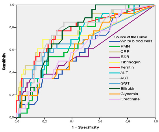 By tracing the AUC, it is revealed that some hematological constants—CRP (AUC = 0.779; 95%CI: 0.672–0.886; p = 0.001), AST (AUC = 0.769; 95%CI: 0.668–0.871; p = 0.001), ferritin (AUC = 0.767; 95%CI: 0.657–0.877; p = 0.001), bilirubin (AUC = 0.758; 95%CI: 0.665–0.851; p = 0.001), fibrinogen (AUC = 0.734; 95%CI: 0.605–0.863; p = 0.001), and ALT (AUC = 0.706; 95%CI: 0.595-0.817; p = 0.002)—may be good predictors of pneumonia through SARS CoV-2 (Table 6, Figure 2).