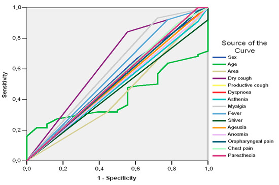 In the case study, the ROC curve shows that, among the signs and symptoms of patients with SARS CoV-2, only dry cough (AUC = 0.643; 95%CI: 0.512–0.774; p = 0.029) and fever (AUC = 0.635; 95%CI: 0.500–0.770; p = 0.039) can be good predictors of pneumonia (AUC > 0.600) (Table 2, Figure 1).