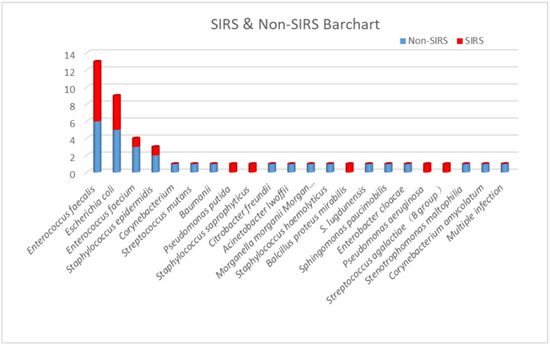 According to urine culture results, Enterococcus faecalis was the most widely recognized microorganism (13 cases, 28%), followed by Escherichia coli (9 cases, 19%), Enterococcus faecium (4 cases, 9%), and Staphylococcus epidermidis (3 cases, 6%). All other positive bacteria were only present in one case. Out of 13 cases, seven (53.8%) with Enterococcus faecalis developed post-PCNL SIRS, and four of nine cases (44.4%) with Escherichia coli developed post-PCNL SIRS. The proportions of SIRS caused by other UC+ bacteria were 25% for Enterococcus faecium (one in four cases) and 33.3% for Staphylococcus epidermidis (one in three cases) (Figure 1 and Figure 2).