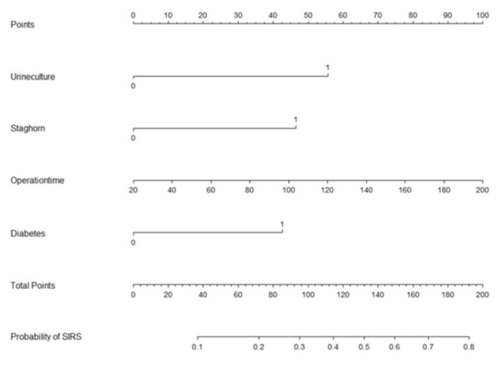 Nomogram with positive urine culture, staghorn calculi, operation time, and diabetes predicts the probability of post-PCNL SIRS.