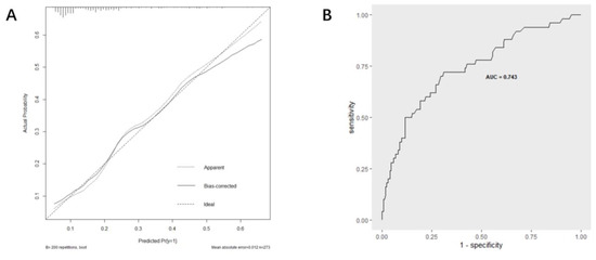 Based on multi-factor analysis, a nomogram prediction model was established to calculate the cumulative probability of SIRS after PCNL (Figure 3). The incidence of SIRS can be calculated by adding together the points assigned to the four factors to obtain the total scale score. The calibration curve shows that the model fits well through the Hosmer–Lemeshow test, with a p value = 0.7148 (>0.05) indicating that there is no statistical difference between the approximate and ideal models (Figure 4A). At the same time, the area under our receiver operating characteristic curve is 0.743, which is very close to the C index (0.742), indicating that our model has good prediction value (Figure 4B).