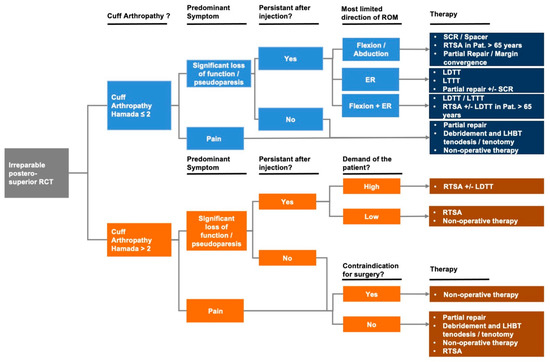 The purpose of this article was to review the current literature and to provide a current concepts overview of available contemporary treatment options for irreparable posterosuperior RCTs as well as to present an evidence- and experience-based clinically applicable treatment algorithm.