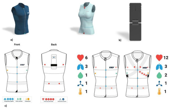 (a) Healer R2 wearable devices (male and female models); (b) logger KoR 1, connecting to the back of the garment for storing the data and transferring it via 4G/5G/Wi-Fi; (c) embedded sensors to detect heart rate, respiratory rate, temperature, saturation and desaturation.